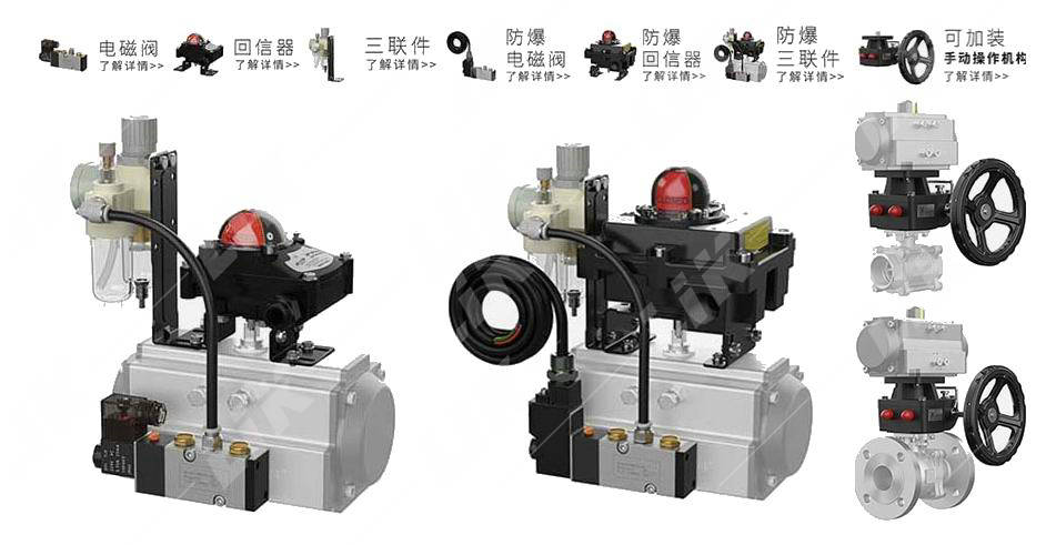 定位器、电磁阀、空气过滤减压器、保位阀、行程开关、阀位传送器、手轮机构等 |